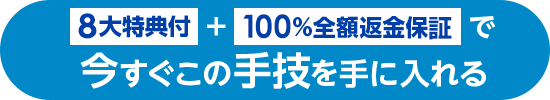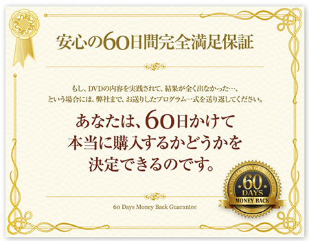 そこで、お求めいただいたDVDの[全額返金満足保証]サービスを設けております。DVDをお手に取っていただき、今よりも技術的なスキルが上がらない、または実践したにも関わらず効果がみられないということであれば、弊社の商品配送日から60日以内(必着)であれば、無条件で全額返金させていただきます。あなたが充分に納得された上でお使いいただきたいので、どうぞ安心してお試しください。