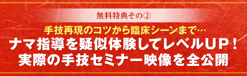 | 【特典2】 ナマ指導を疑似体験してレベルUP!実際の手技セミナー映像(オンライン映像) |