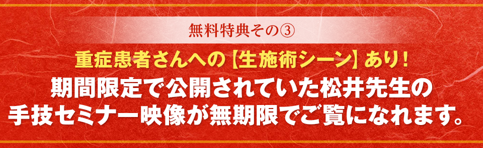 | 【特典3】 期間限定で公開されていた手技セミナー映像の無期限閲覧権(オンライン映像) |