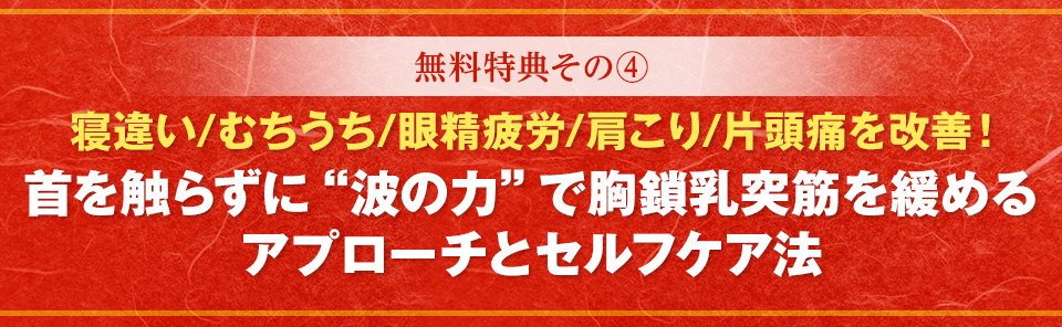 | 【特典4】 首を触らずに“波の力”で胸鎖乳突筋を緩めるアプローチ<セルフケアつき>(オンライン映像) |