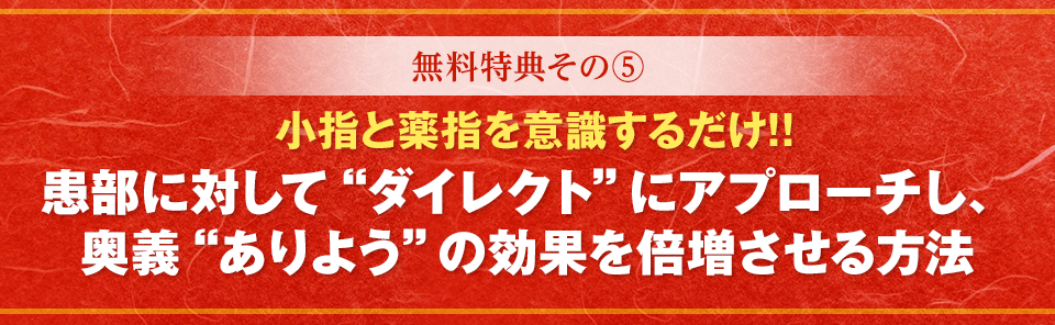 | 【特典5】 小指と薬指を意識するだけ!!奥義“ありよう”の効果を倍増させる方法(オンライン映像) |