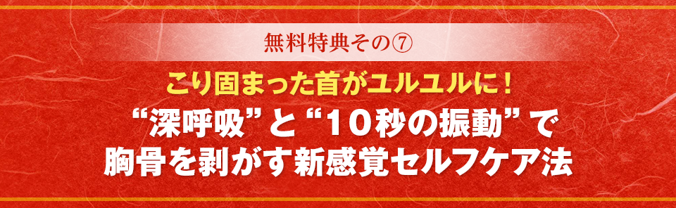 | 【特典7】 こり固まった首がユルユルに!“10秒の振動”で胸骨を剥がす新感覚セルフケア法(オンライン映像) |