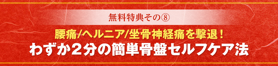 | 【特典8】 腰痛/ヘルニア/坐骨神経痛を撃退!わずか2分の簡単骨盤セルフケア法(オンライン映像) |