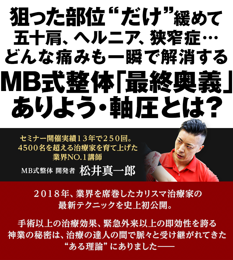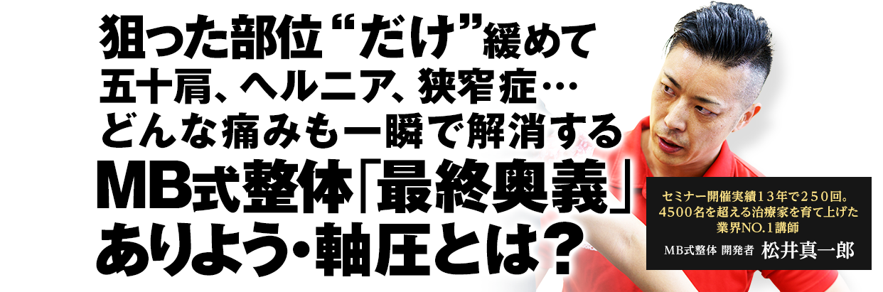 ぜひこのチャンスを逃さず、“明日から”MB式整体を使いこなし、患者さんの取り切れなかった痛みを取り切ってあげてください。
