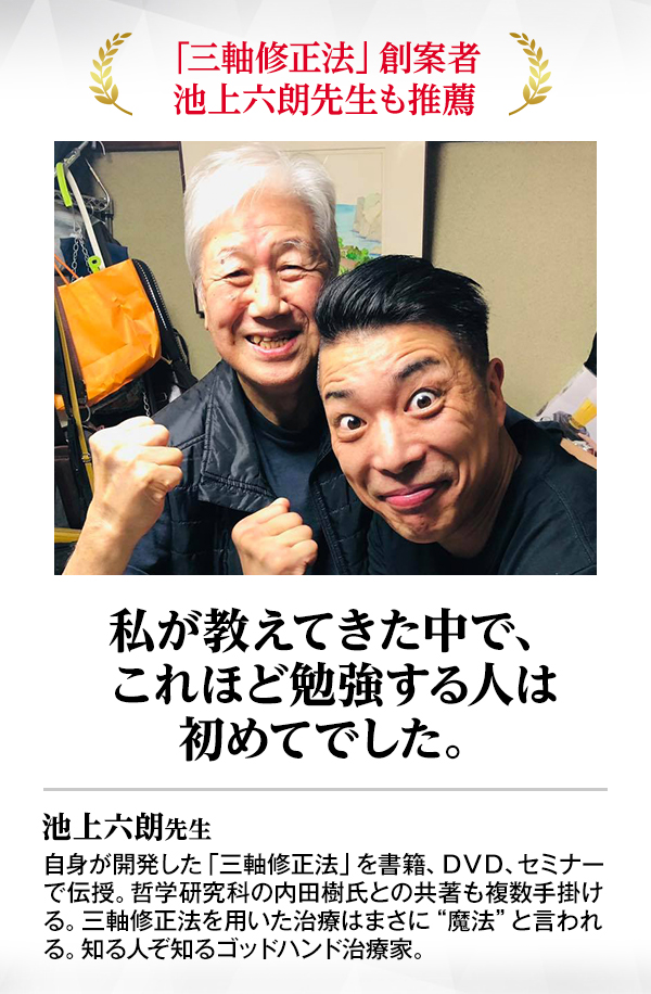 現に、映像をみただけで治療家ではない私が効果を出すことができたほど、その再現性はずば抜けています。先生も手に取っていただければ感じられると思い、今回は「ありよう/軸圧」の一部を体験していただけるDVDまで無料でプレゼントさせていただきました。