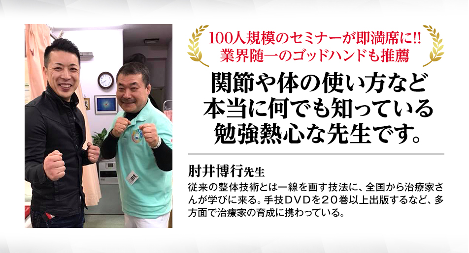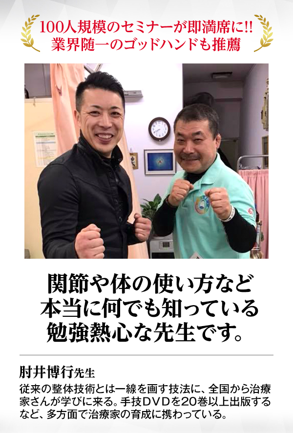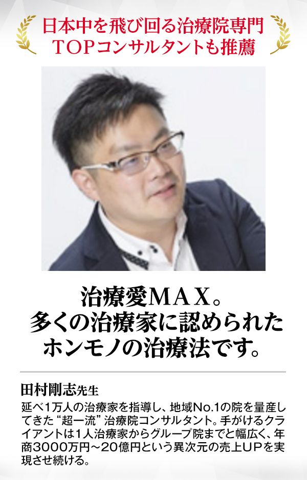 治療家やリラクゼーションの経営者はもちろん、素人でさえ結果を出せるのが素晴らしい。今の手技効果を倍増したいと考える全ての人にオススメしたい手技ですね。